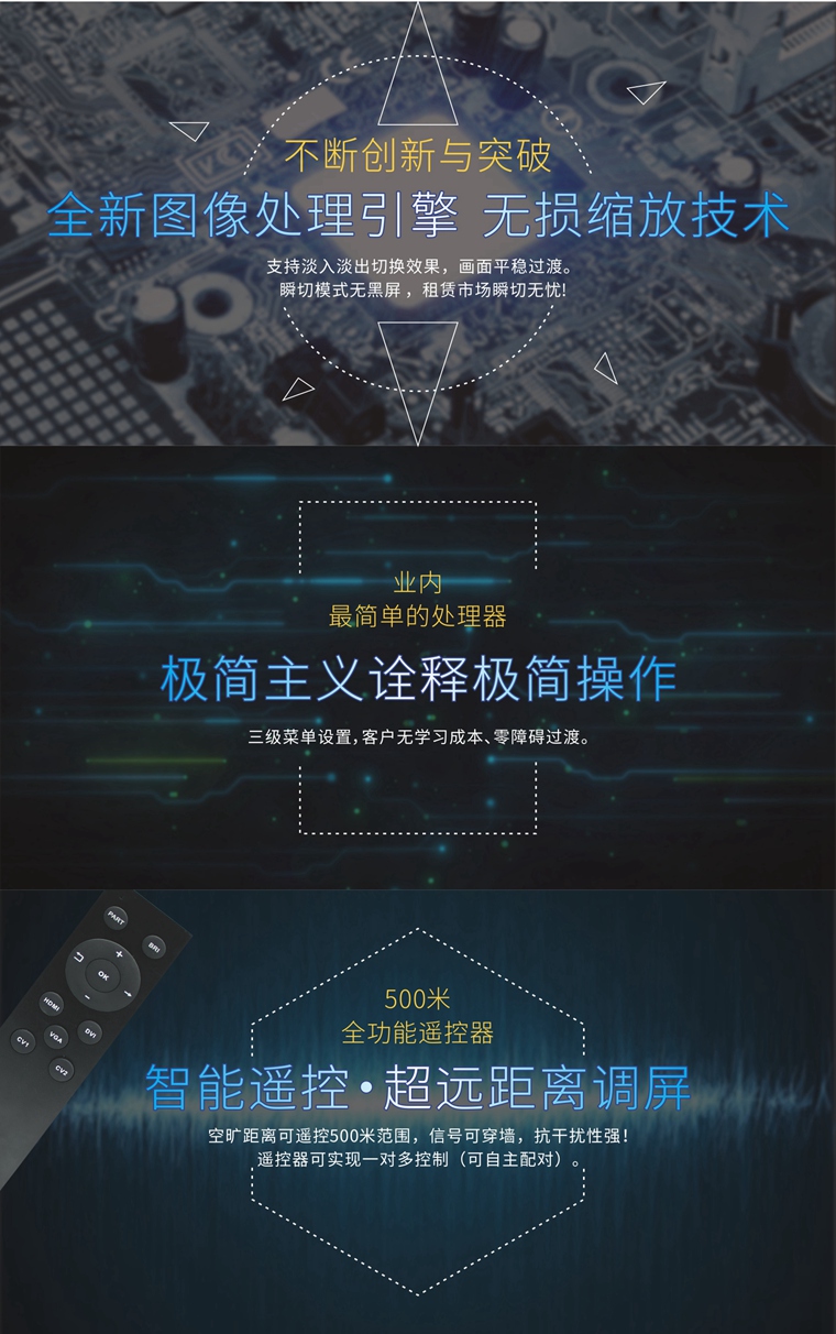 8) 支持淡入淡出,瞬切無(wú)黑屏:⒈支持淡入淡出切換效果,畫(huà)面平穩過(guò)渡。⒉瞬切模式無(wú)黑屏 ,租賃市場(chǎng)瞬切無(wú)憂(yōu)!