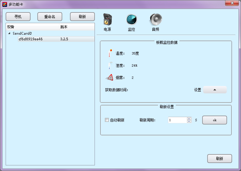 I、監控功能:獲取環(huán)境溫度、濕度、煙霧參數;設置刷新時(shí)間;設置觸發(fā)報警;報警恢復;聯(lián)鎖電源開(kāi)關(guān)。