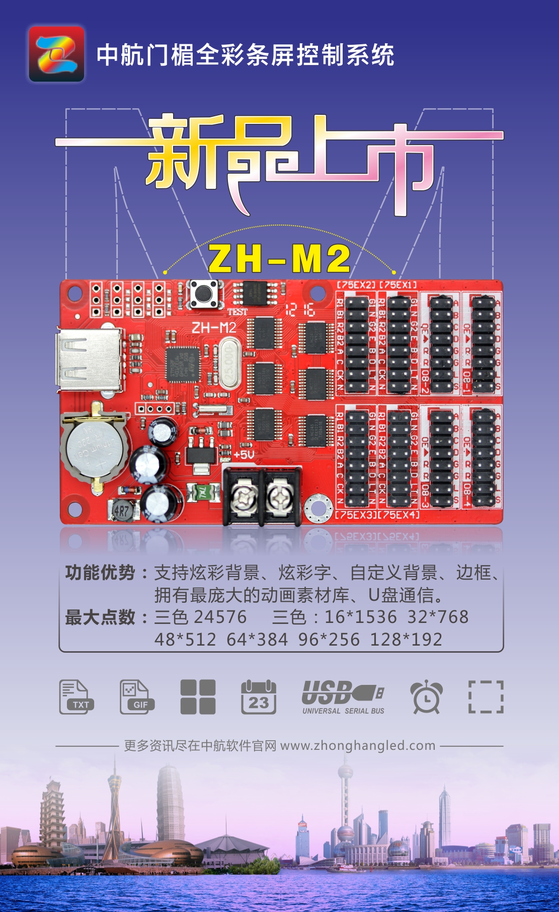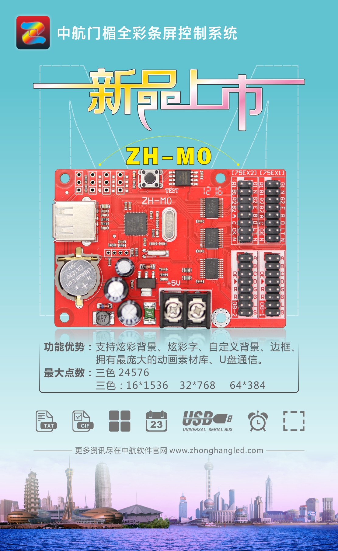溫馨提示:門(mén)楣全彩條屏控制系統需下載專(zhuān)用軟件,請到我們官網(wǎng)(www.zhonghangled.com)下載中心里下載。