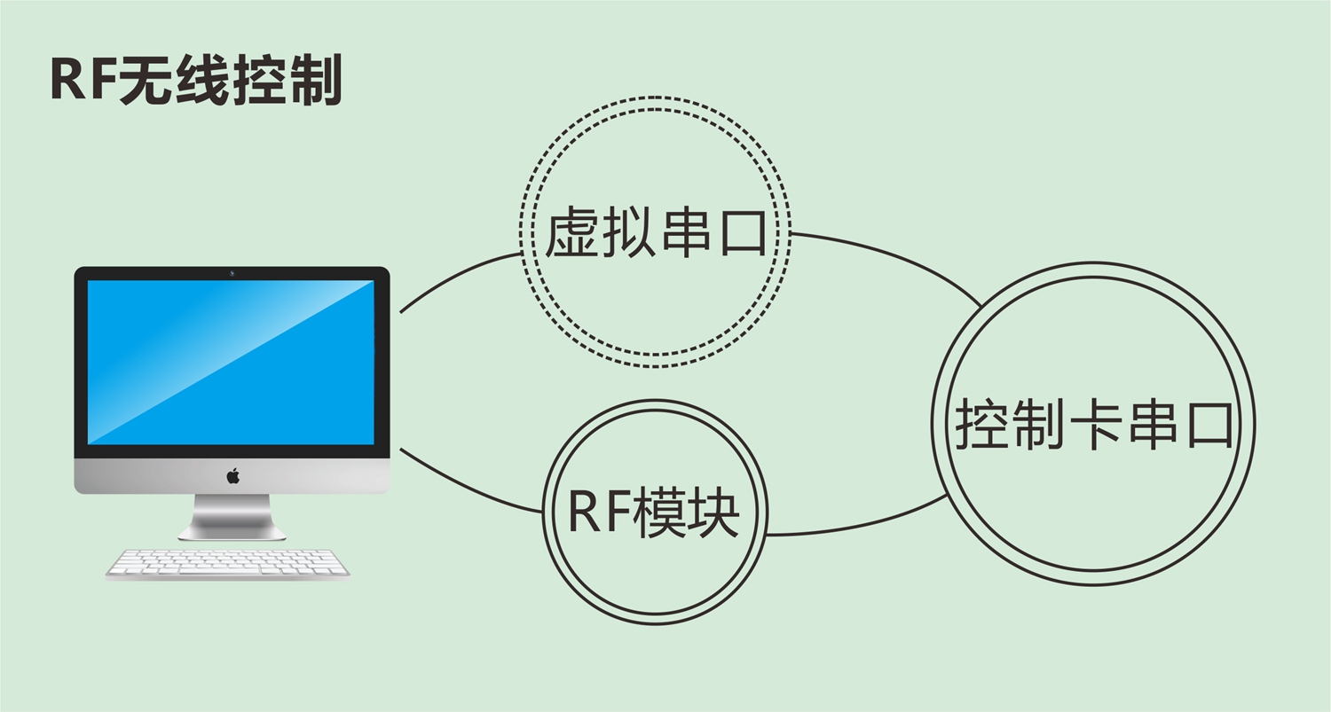 工作原理:RF模塊一端接到控制電腦,另一端接到控制卡串口,電腦安裝驅動(dòng)程序后,產(chǎn)生一個(gè)虛擬串口,并通過(guò)此串口發(fā)送數據。