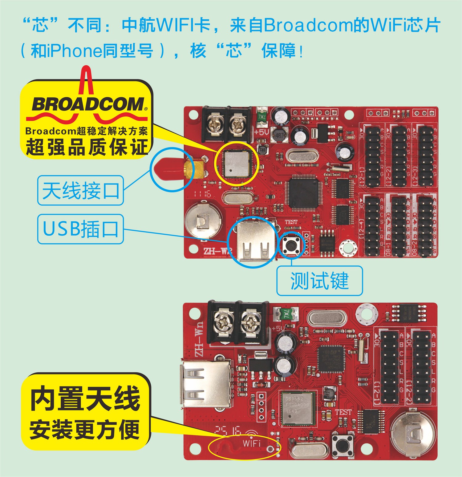 對于LED控制系統,一方面:WIFI卡就相當于一個(gè)無(wú)線(xiàn)路由器,打開(kāi)手機WIFI找到控制卡發(fā)出的信號(ZH-W開(kāi)頭的WIFI信號)連接,再進(jìn)入操作軟件LED魔寶操作;另一方面:WIFI芯片幾乎決定控制卡的信號強度、信號穩定性及長(cháng)時(shí)間運行是否頻點(diǎn)漂移。