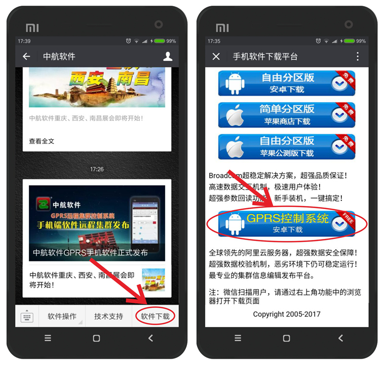 第1種方法:進(jìn)入中航軟件微信公眾平臺,點(diǎn)擊右下角“軟件下載”--點(diǎn)擊“GPRS控制系統安卓下載”按鈕。使用瀏覽器打開(kāi),點(diǎn)擊下載,安裝完畢即可使用。