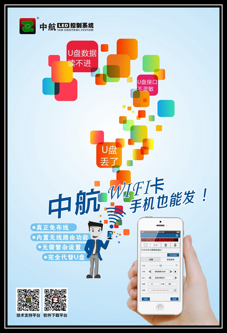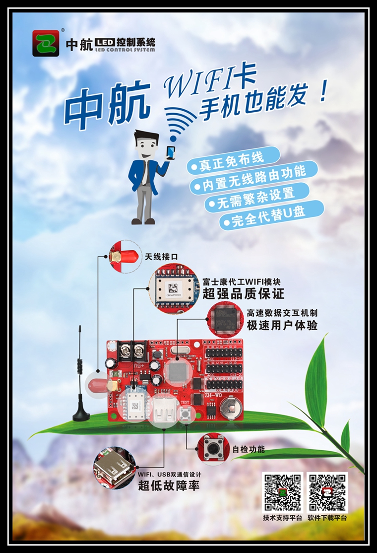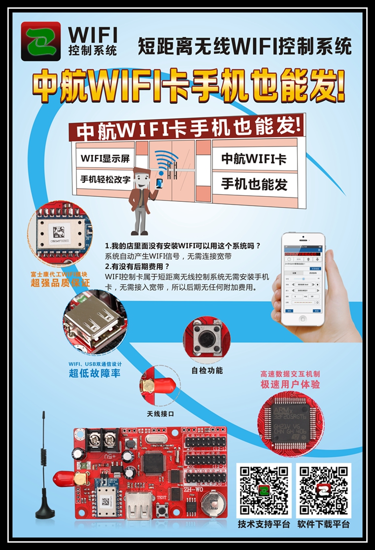 我公司推出V3版WiFi控制系統,軟件操作簡(jiǎn)單好用,免布線(xiàn)、免U盤(pán)、無(wú)需連接寬帶,更無(wú)后期任何附加費用,高質(zhì)量方案,更容易被行業(yè)人員所接受使用,我們相信中航無(wú)線(xiàn)WiFi控制系統正在創(chuàng )造另一個(gè)神話(huà)——無(wú)線(xiàn)WiFi控制卡取代U盤(pán)控制卡成為市場(chǎng)主流產(chǎn)品。